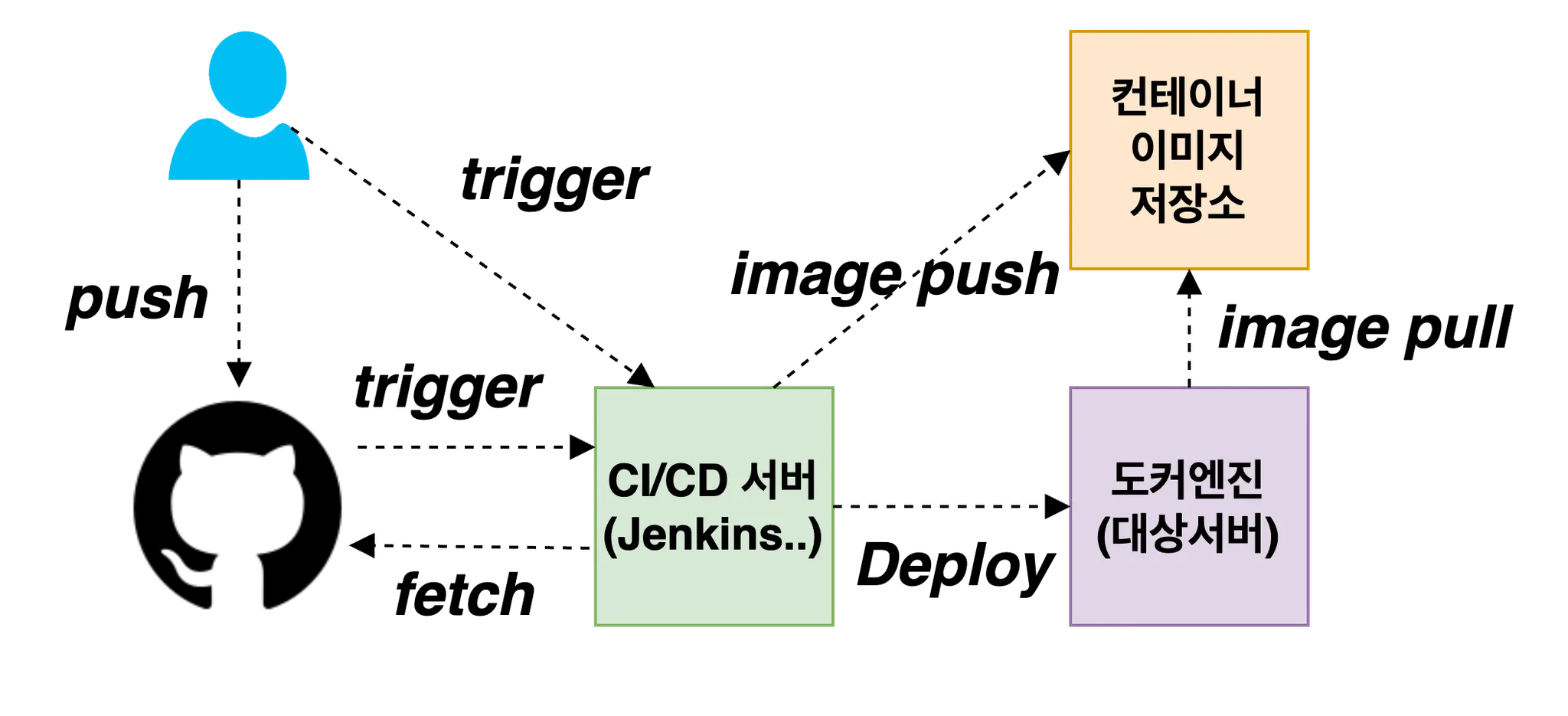 앞서 구성했던 내용을 종합해서 아래와 같은 일련의 과정으로 CI/CD 환경을 구성해 봅니다.