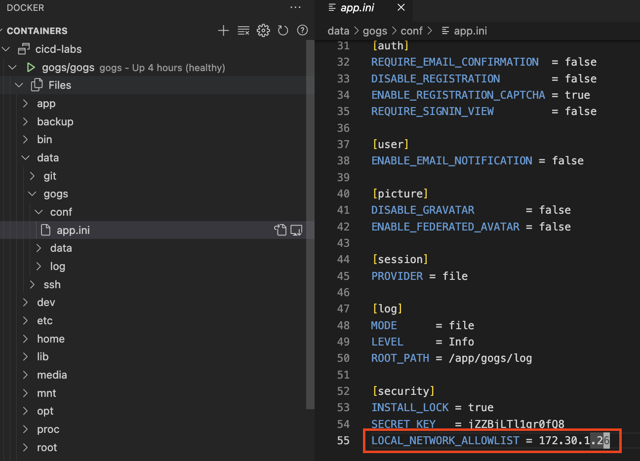 gogs 에 app.ini 파일 수정해 줍니다.