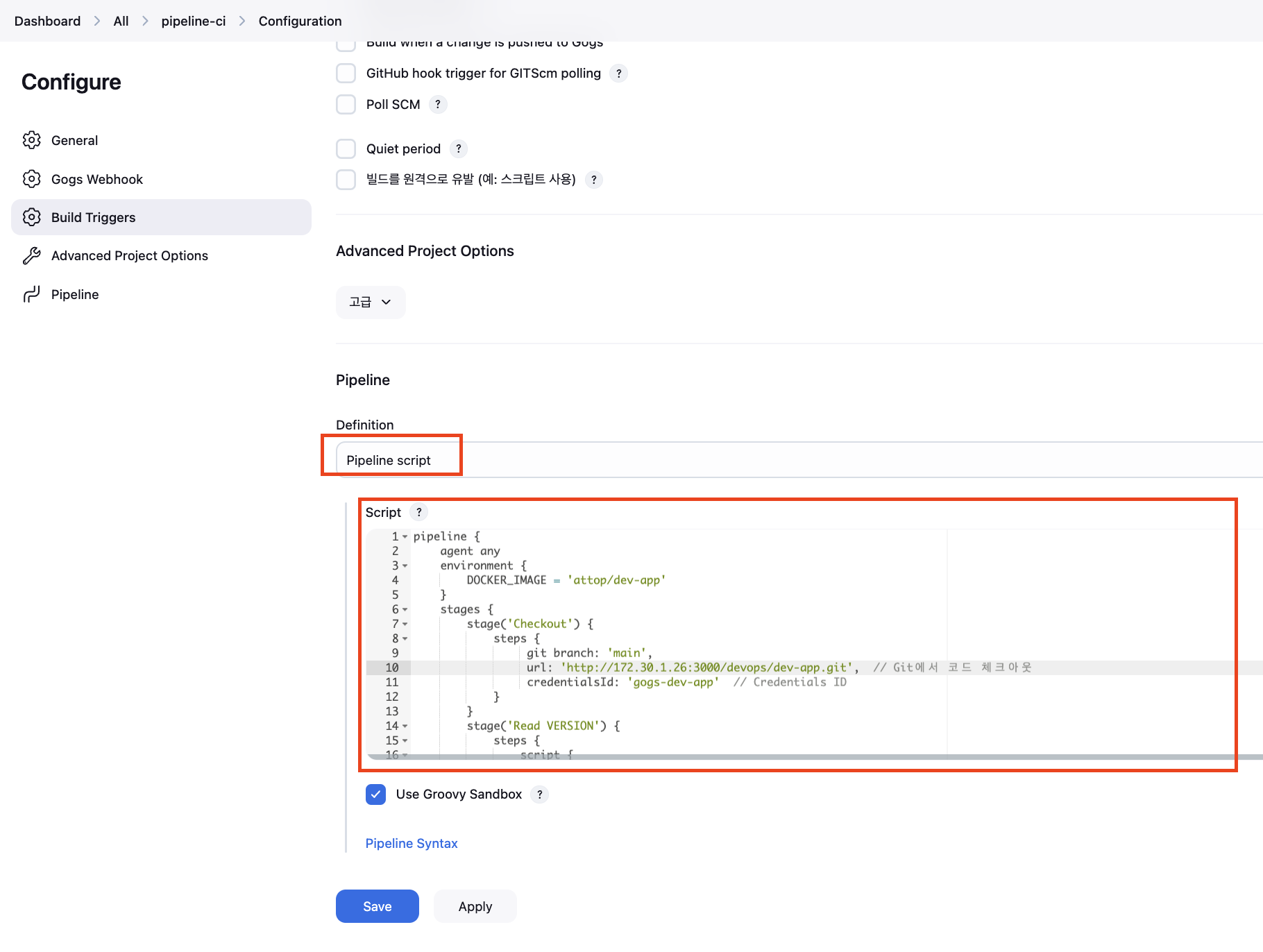 - GitHub project : `http://172.30.1.26:3000/devops/dev-app` - Use Gogs secret : **qwe123** - Build Triggers : **Build when a change is pushed to Gogs 체크** - Pipeline script from SCM - SCM : Git - Repo URL(`http://***<mac IP>***:3000/***<Gogs 계정명>***/dev-app`) - Credentials(**devops/*****) - Branch(***/main**) - Script Path : **Jenkinsfile**