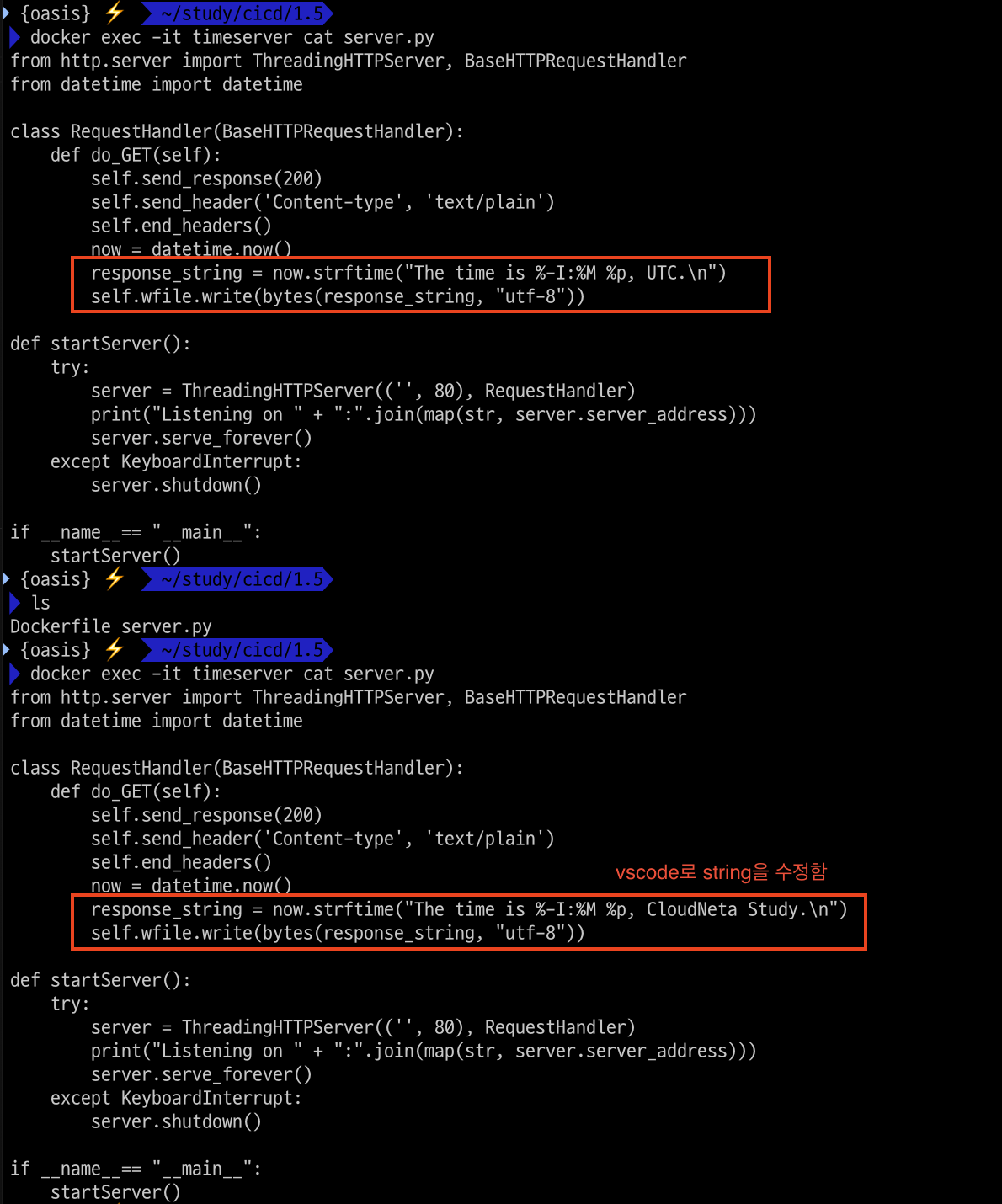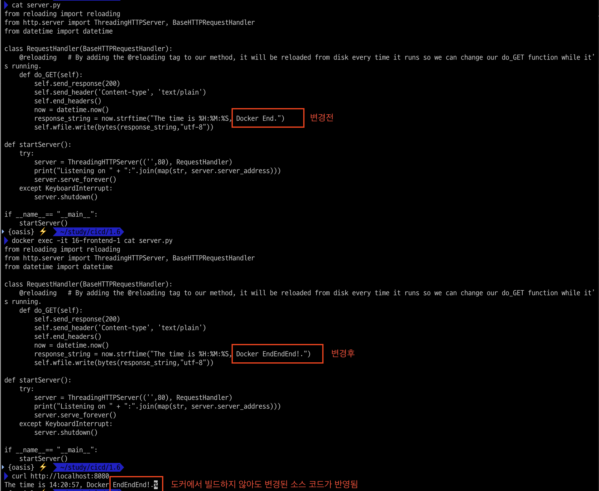 server.py 수정 후 VERSION 수정 후 push 후 생성된 컨테이너 접속 후 반영 확인