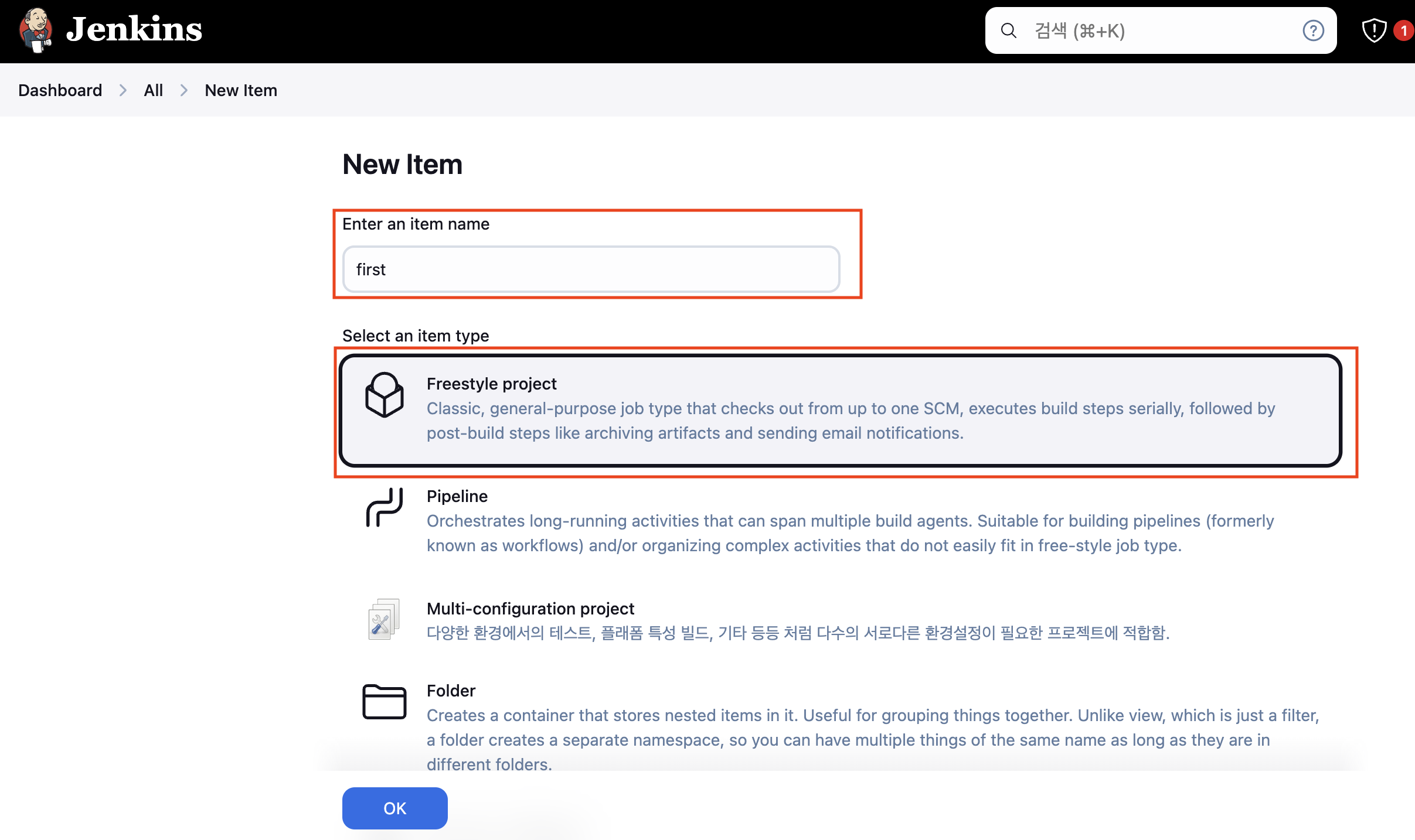 Jenkins Dashboard에서 New Itme을 선택한 후 "SCM-Pipeline"라고 item name을 지정하고 type은 "Pipeline"를 선택 후 생성합니다.