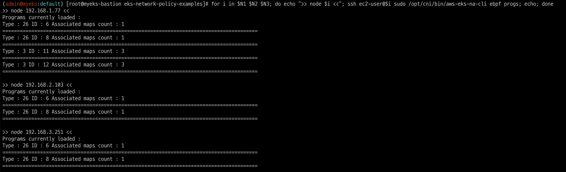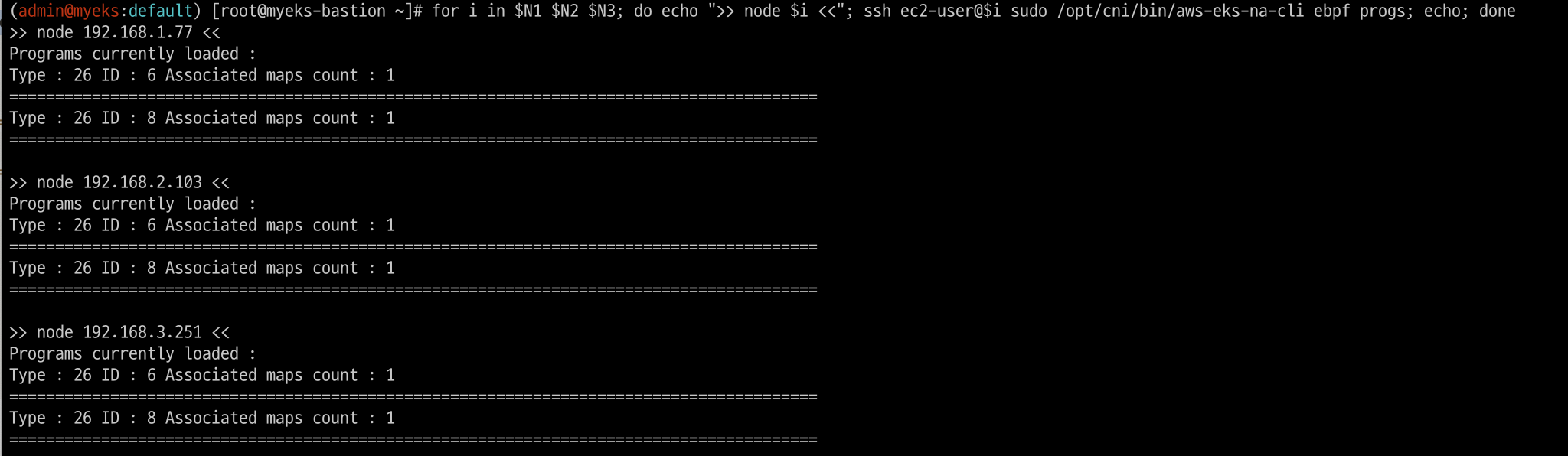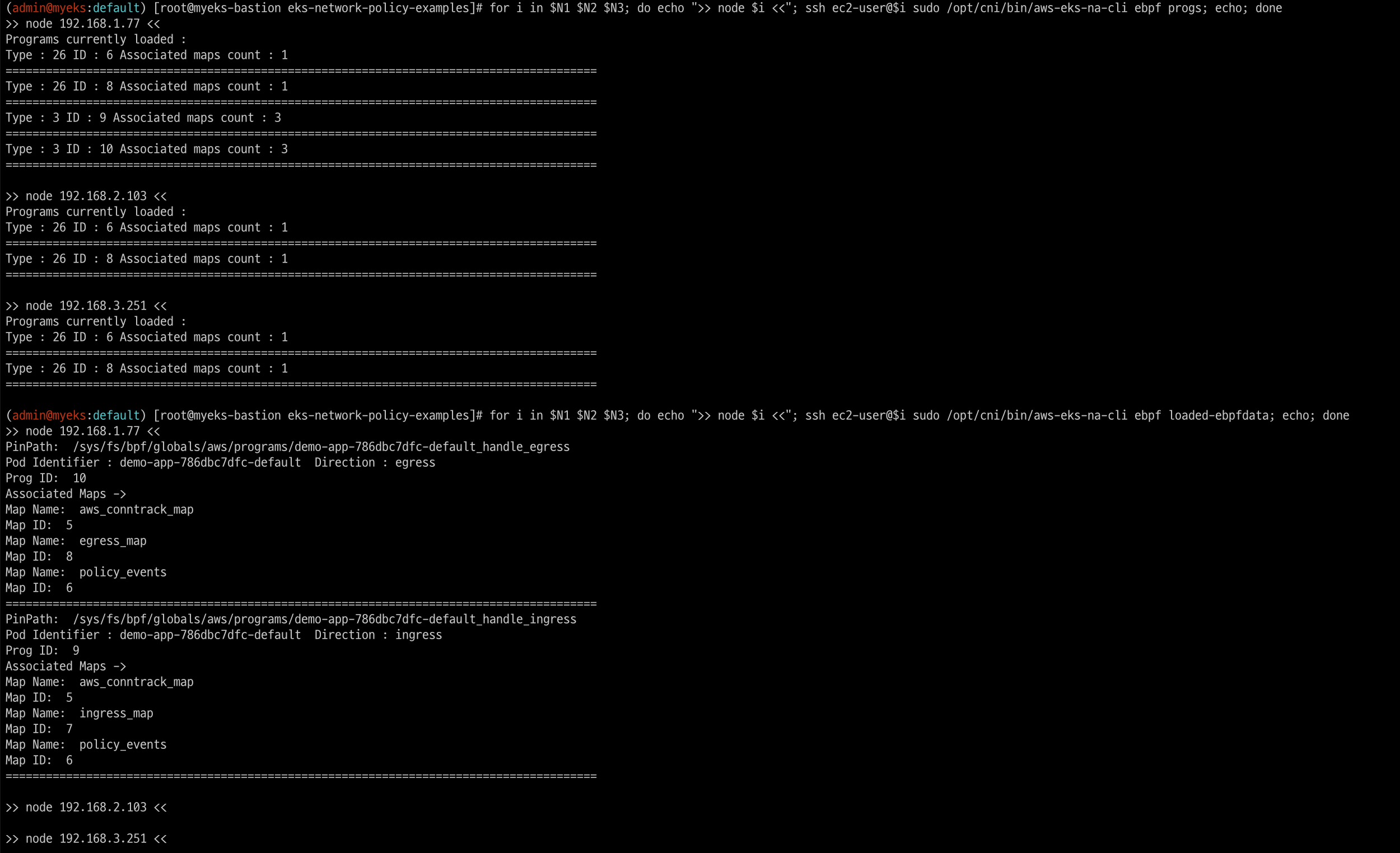 for i in $N1 $N2 $N3; do echo ">> node $i <<"; ssh ec2-user@$i sudo /opt/cni/bin/aws-eks-na-cli ebpf loaded-ebpfdata; echo; done