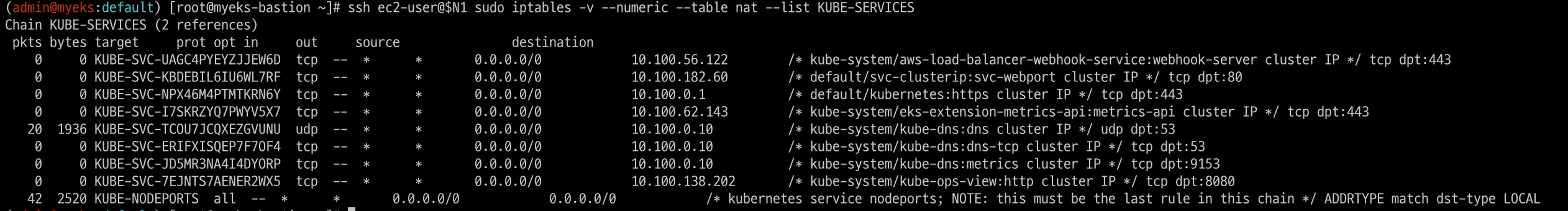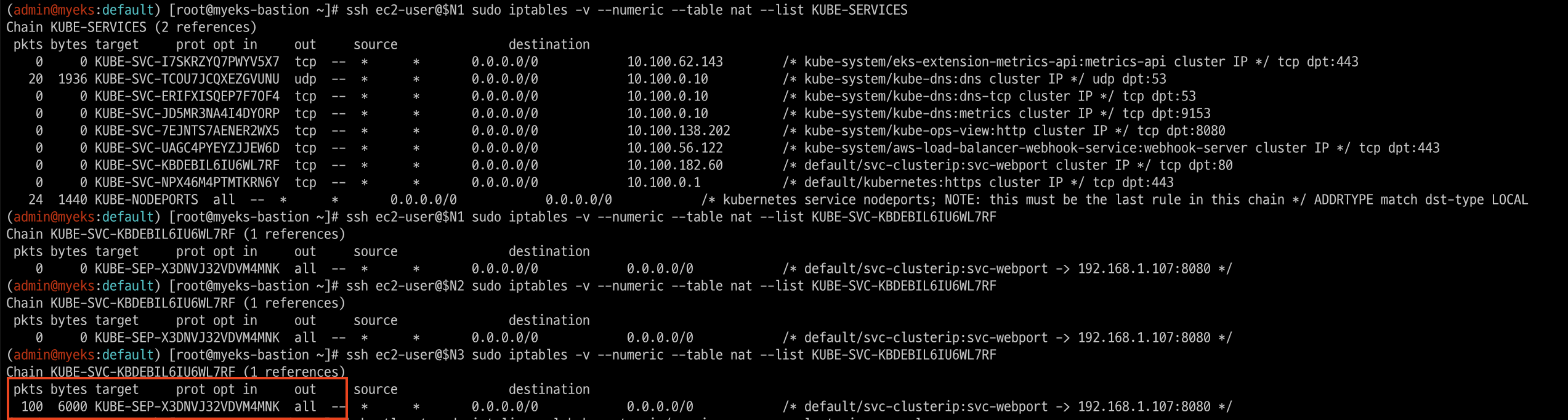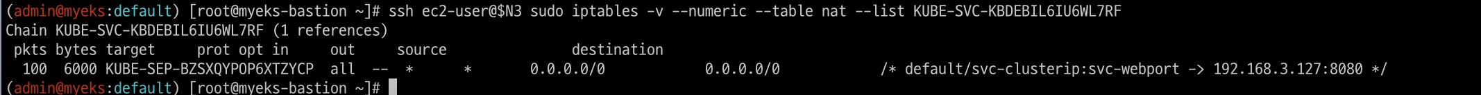 watch -d 'sudo iptables -v --numeric --table nat --list AWS-SNAT-CHAIN-0; echo ; sudo iptables -v --numeric --table nat --list KUBE-POSTROUTING; echo ; sudo iptables -v --numeric --table nat --list POSTROUTING'