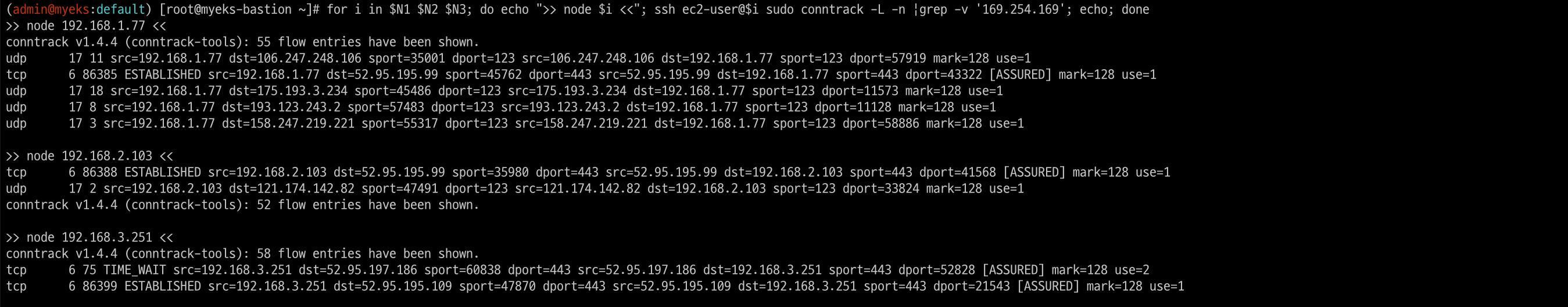 for i in $N1 $N2 $N3; do echo ">> node $i <<"; ssh ec2-user@$i sudo conntrack -L -n |grep -v '169.254.169'; echo; done