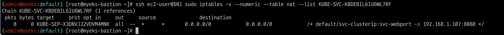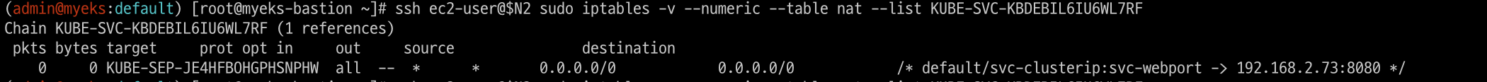 # 카운트 확인 시 AWS-SNAT-CHAIN-0에 매칭되어, 목적지가 192.168.0.0/16 아니고 외부 빠져나갈때 SNAT 192.168.1.251(EC2 노드1 IP) 변경되어 나간다!