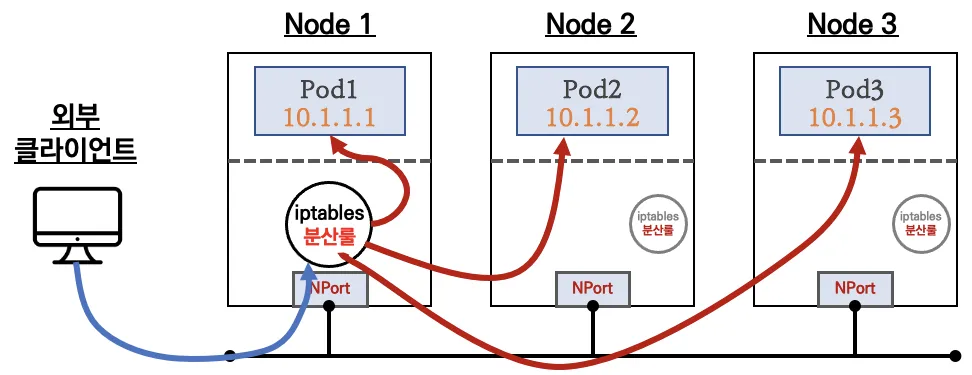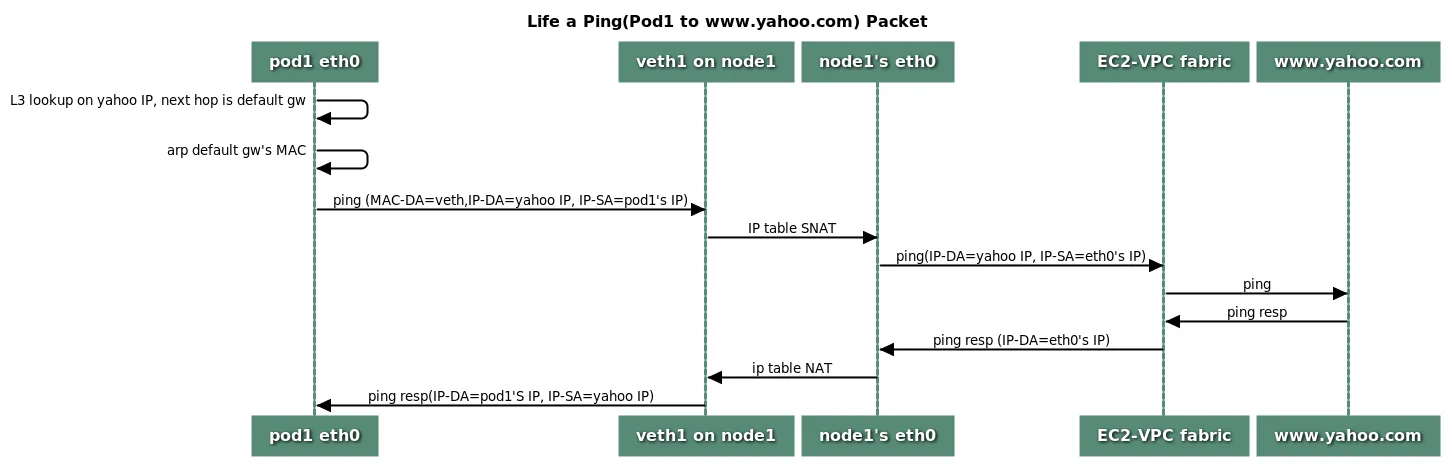 파드에서 외부 통신 흐름 : iptable 에 SNAT 을 통하여 노드의 eth0 IP로 변경되어서 외부와 통신됨