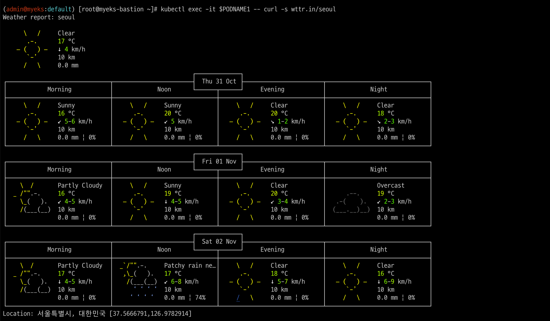 kubectl exec -it $PODNAME1 -- curl -s wttr.in/seoul