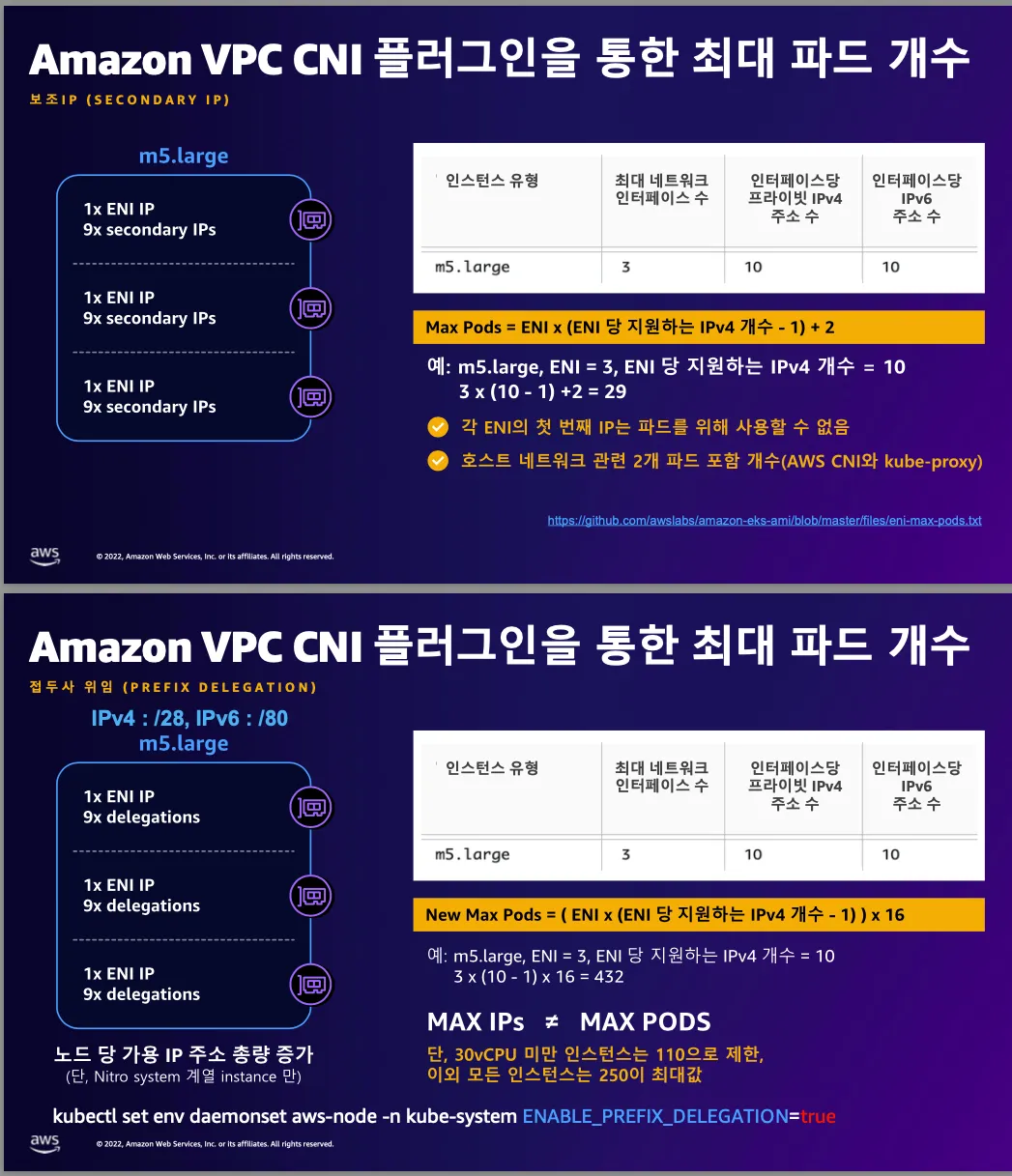 인스턴스 타입 별 ENI 최대 갯수와 할당 가능한 최대 IP 갯수에 따라서 파드 배치 갯수가 결정됨(단, aws-node 와 kube-proxy 파드는 호스트의 IP를 사용함으로 최대 갯수에서 제외함)