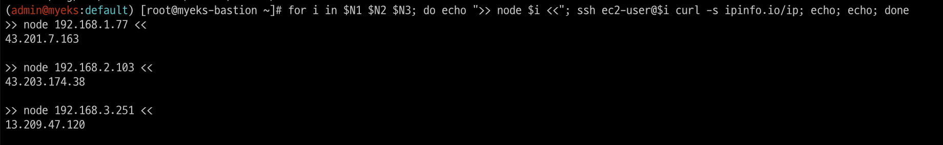 for i in $N1 $N2 $N3; do echo ">> node $i <<"; ssh ec2-user@$i curl -s ipinfo.io/ip; echo; echo; done