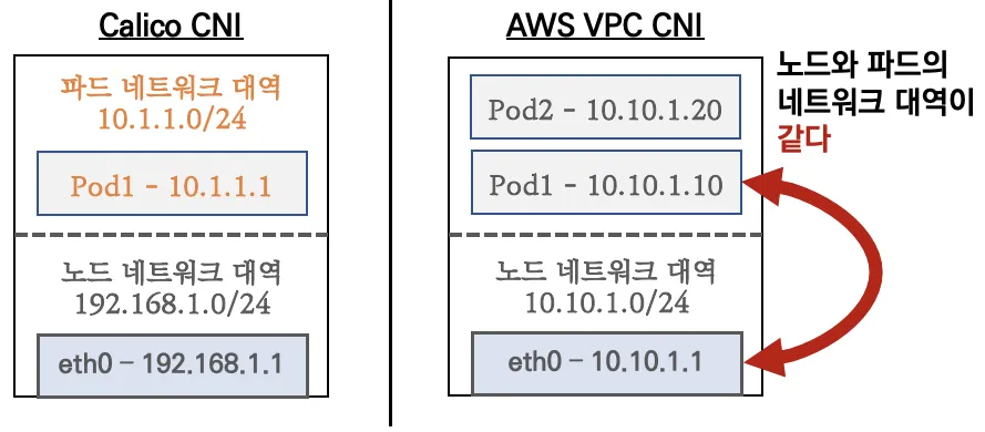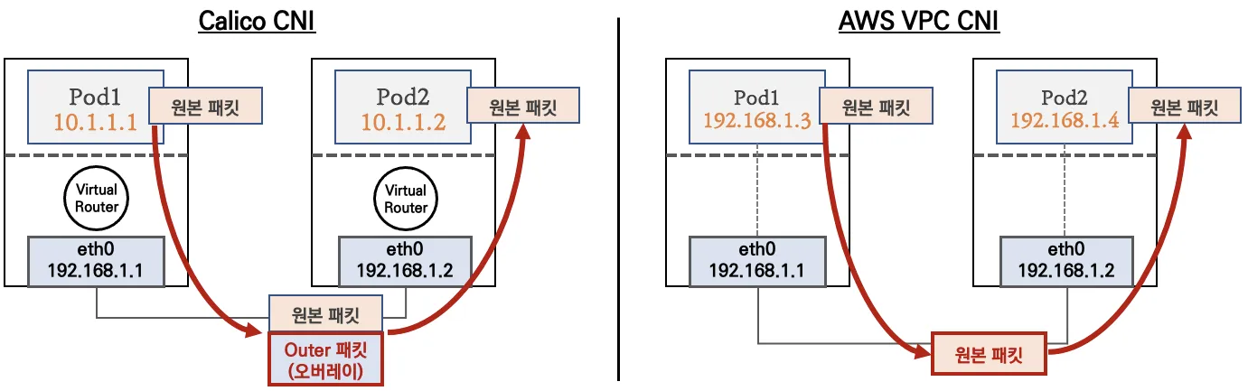 파드간 통신 시 일반적으로 K8S CNI는 오버레이(VXLAN, IP-IP 등) 통신을 하고, AWS VPC CNI는 동일 대역으로 직접 통신을 합니다.
