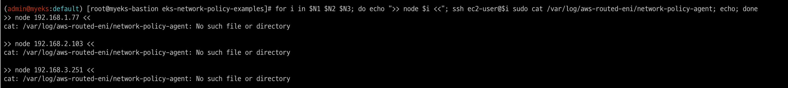 for i in $N1 $N2 $N3; do echo ">> node $i <<"; ssh ec2-user@$i sudo cat /var/log/aws-routed-eni/network-policy-agent; echo; done