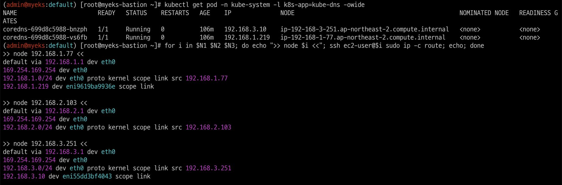 coredns-6777fcd775-57k77 1/1 Running 0 70m 192.168.1.142 ip-192-168-1-251.ap-northeast-2.compute.internal <none> <none>