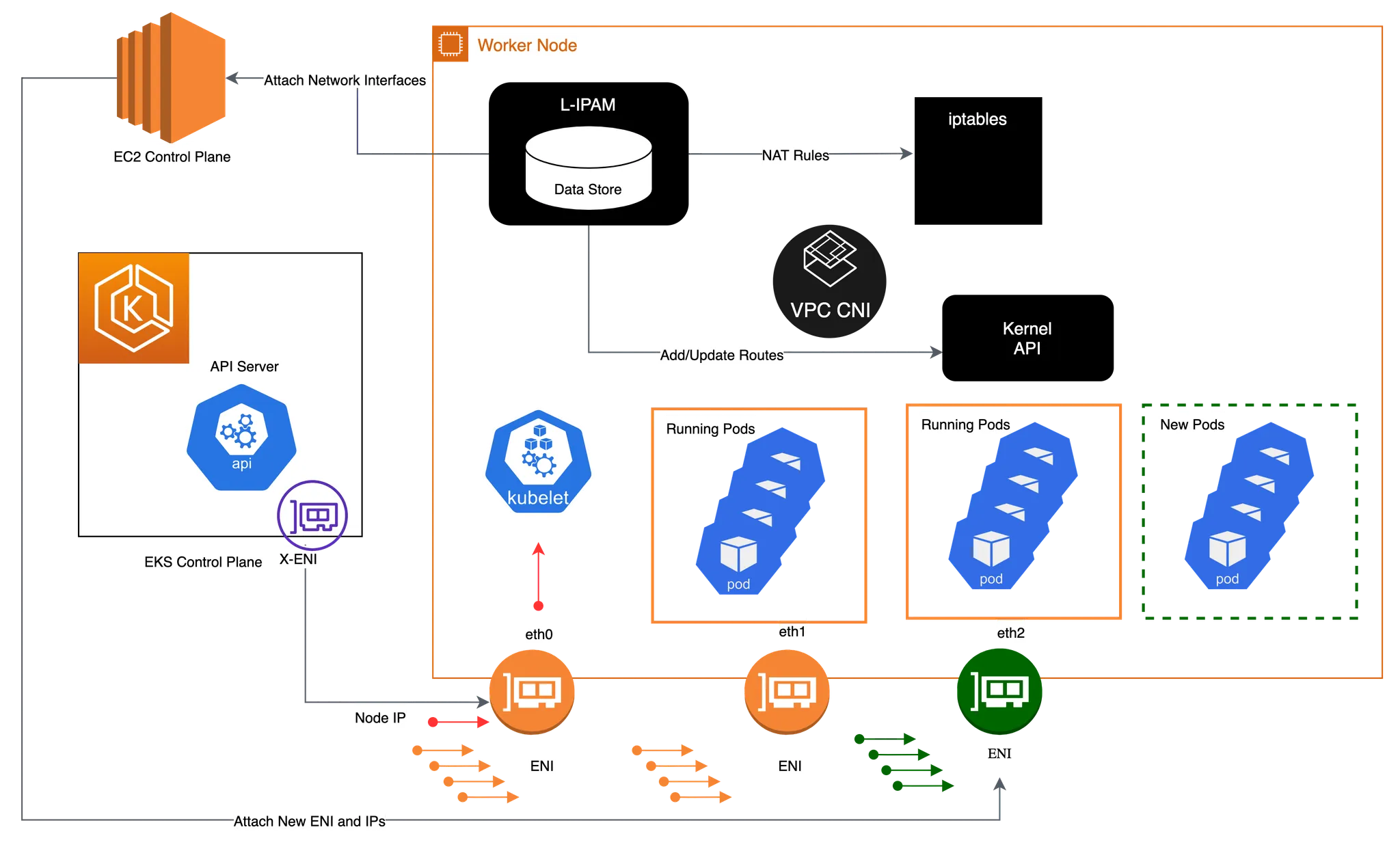 ## For Pod to external (outside VPC) traffic, we will program iptables to SNAT using Primary IP address on the Primary ENI.