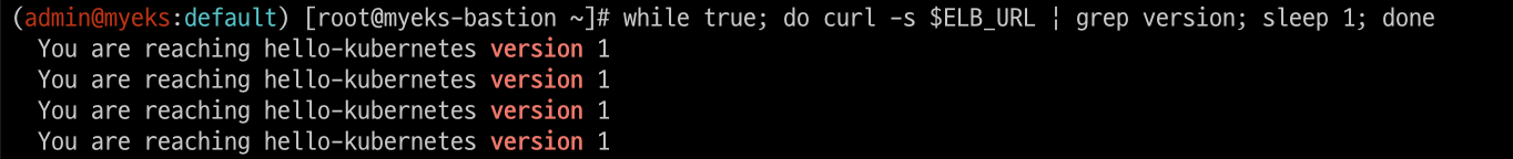 while true; do kubectl exec -it client-one -- curl --connect-timeout 1 demo-app ; date; sleep 1; done