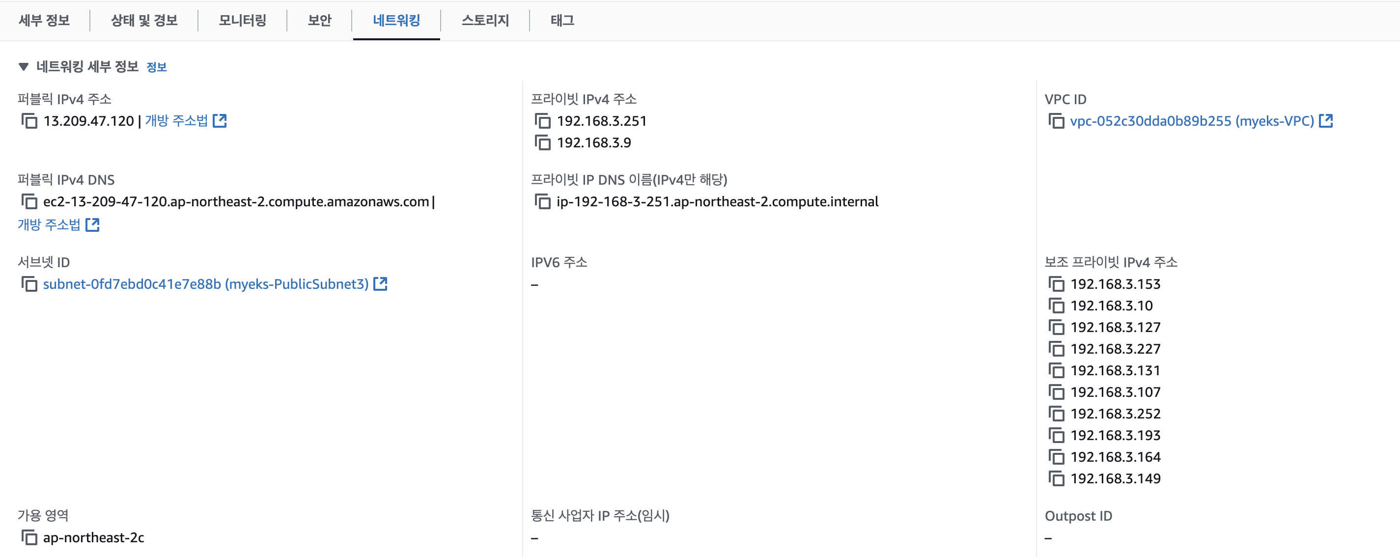 인스턴스의 네트워크 정보 확인 : 프라이빗 IP와 보조 프라이빗 IP 확인