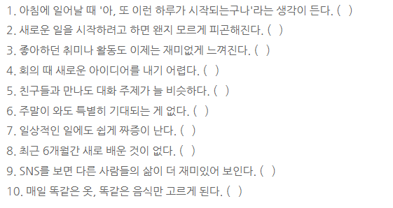 성취감이, 발전이 없어서 그런가.. 인터넷에서 매너리즘 테스트를 해보았다.