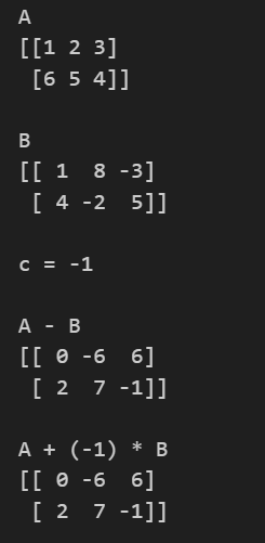 print(f"A + (-1) * B \n{A + (-1) * B}\n")