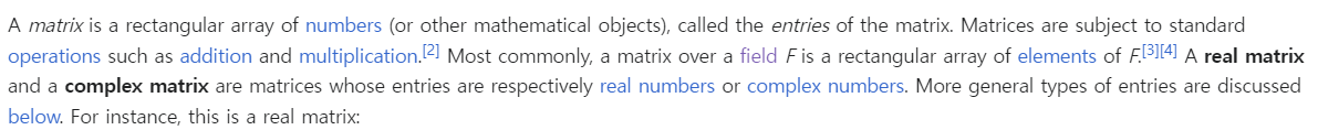 위키백과의 정의는 위와 같습니다. 즉, 사각형에 숫자들을 담고 있는데 그 숫자(= aij)들이 순서가 있는 숫자들의 배열(Array)이라 할 수 있을 것 같습니다. i가 행(row)을 의미하고 j는 열(column)을 의미합니다.