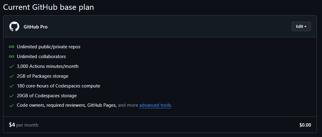 필자는 현재 Github Education으로 다음과 같은 사용량 제한이 있다.