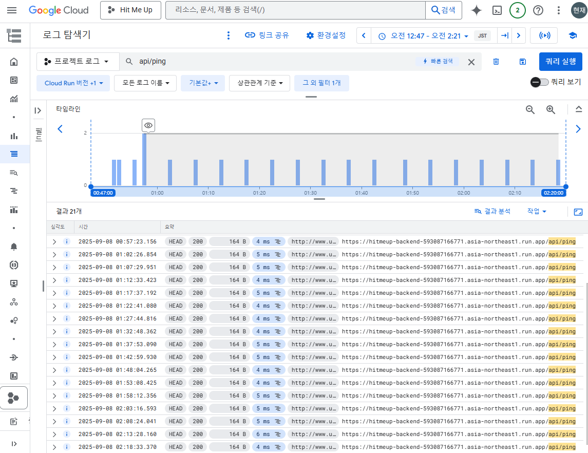 위 사진은 Cloud Run 로그 탐색기에서 warmer 요청인 ping 엔드포인트 로그를 확인한 결과다.