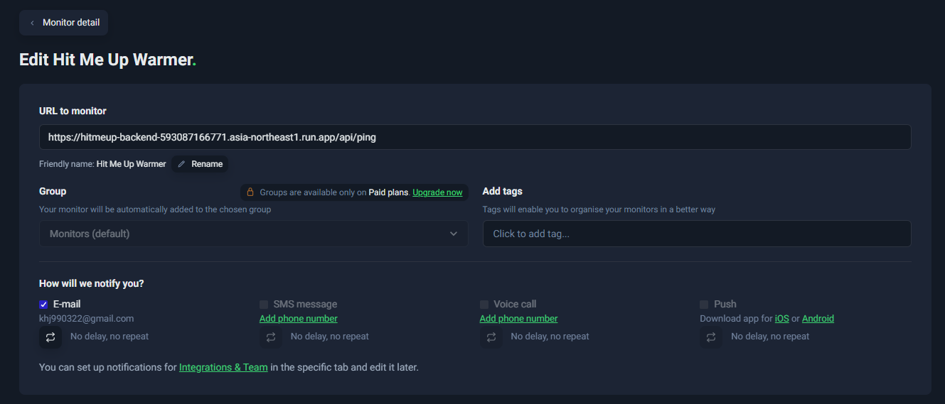 ps. 무료로 콜드 스타트를 해결하고 싶다면, UptimeRobot을 강력히 추천한다. GitHub Actions의 불안정함과 비용 문제를 모두 해결해주는 완벽한 솔루션이다. (광고아님)