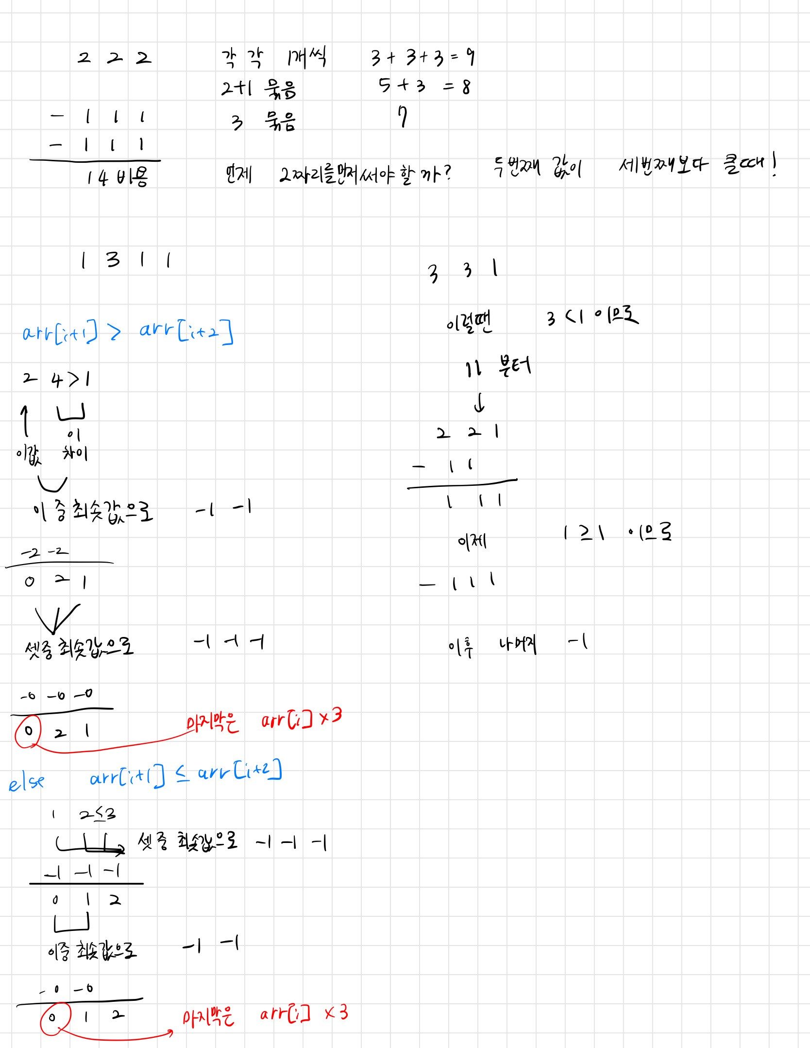 각 위치 i에서 현재 수 arr[i]를 0으로 만들어야 한다. a[i+1]과 a[i+2]를 비교하여 두 가지 경우로 나눌 수 있다.
