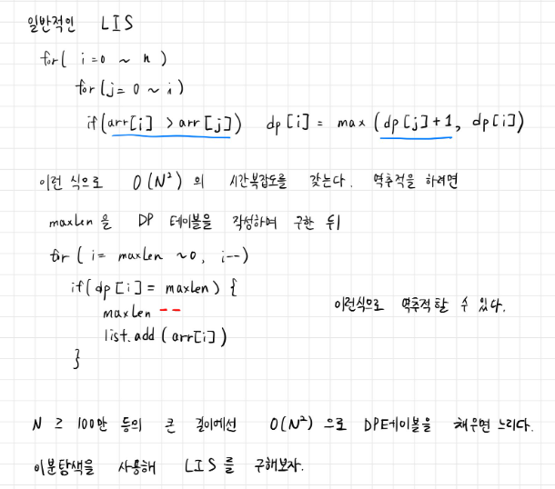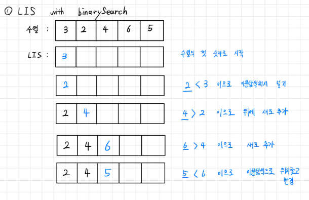 LIS알고리즘을 이분탐색을 적용해보았다. N이 클때 O(NlogN)으로 완료해야한다.