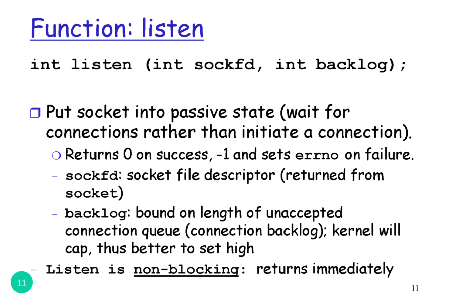 3. listen() : 이 소켓으로 listen 하겠다. non-blocking(함수 호출 시 조건이 만족되지 않더라도 함수가 리턴하므로 해당 스레드는 계속 진행)