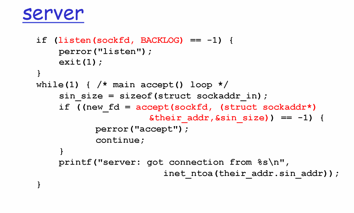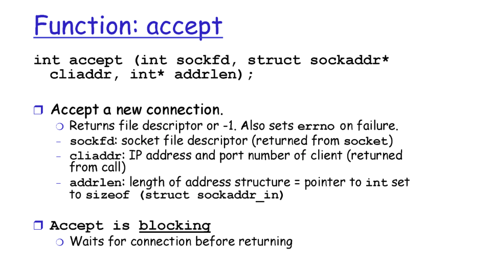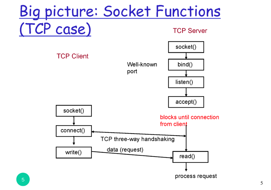 5. block until connection from client : 서버는 클라이언트로부터 연결이 들어올 때까지 block된다