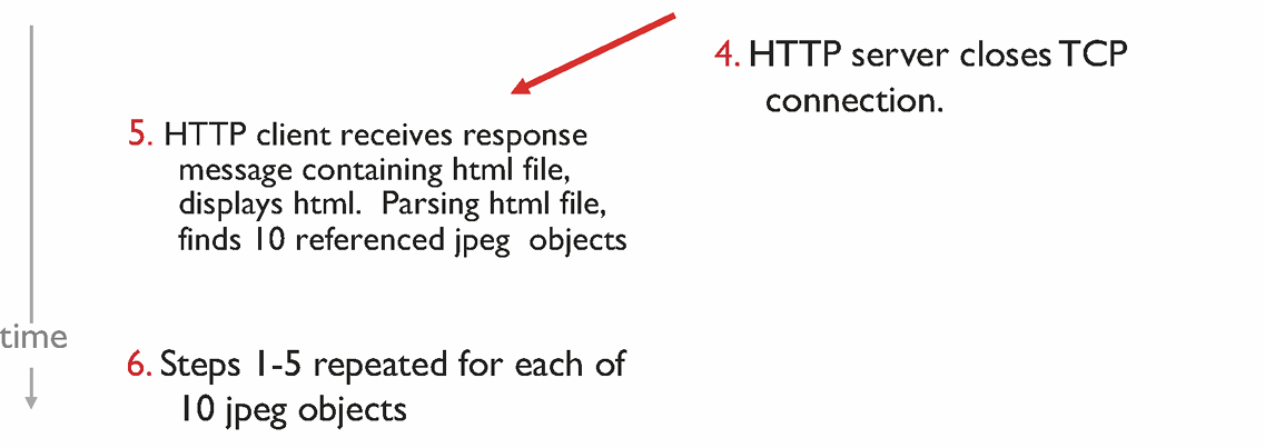 5. HTTP 클라이언트가 html 파일이 포함된 응답 메시지를 수신하고 html을 표시. html 파일을 파싱하여 10개의 참조된 jpeg 객체를 발견