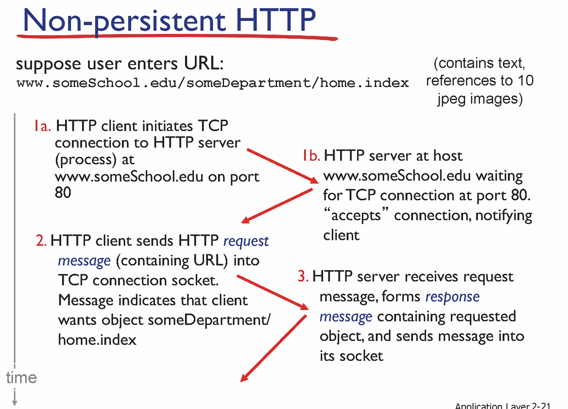 - (a) HTTP 클라이언트가 HTTP 서버(프로세스)와 www.someSchool.edu의 80번 포트로 TCP 연결을 시작