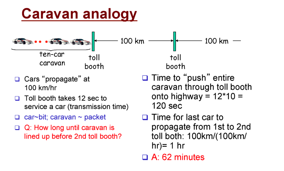 - 앞에 bit가 link에 도달하는 시간에 비해 link에서 전달되는 속도는 광속이기에 상대적으로 매우빠르다. 그냥 link에 도착하면 바로 다음 라우터로 전달된다고 봐도 된다. 그렇지만 패킷 단위로 움직이기 때문에 모든 bit들이 다음 라우터에 전달되어야 다시 다음 step이 진행된다. 일부분만 도달되어선 진행되지 않는다. 따라서 패킷 스위칭은 패킷 단위로 진행되어야 한다는 점에 유의!