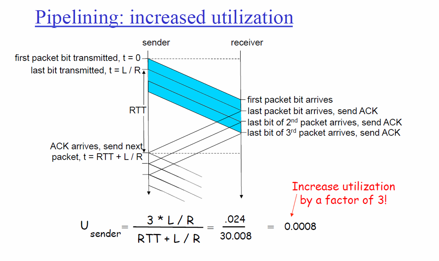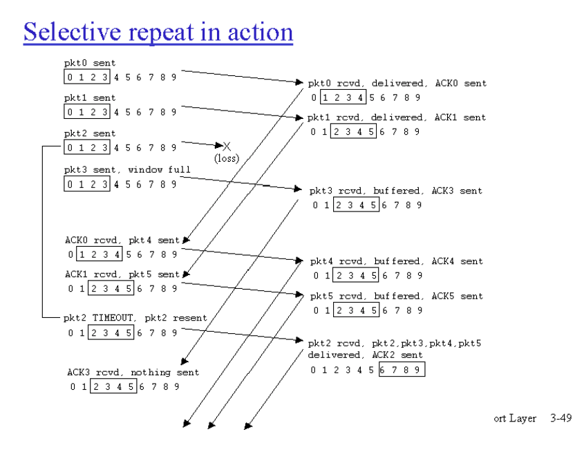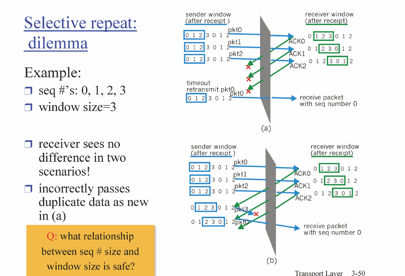 - 먼저 패킷 0의 타이머가 타임아웃이 터질것이다. 그래서 패킷 0을 재전송하는것인데 이것의 Sequence # 가 0이기 때문에 3 다음의 번호가 다시 0으로 반복되니까 새로운 패킷인줄 알게 되는 것이다.