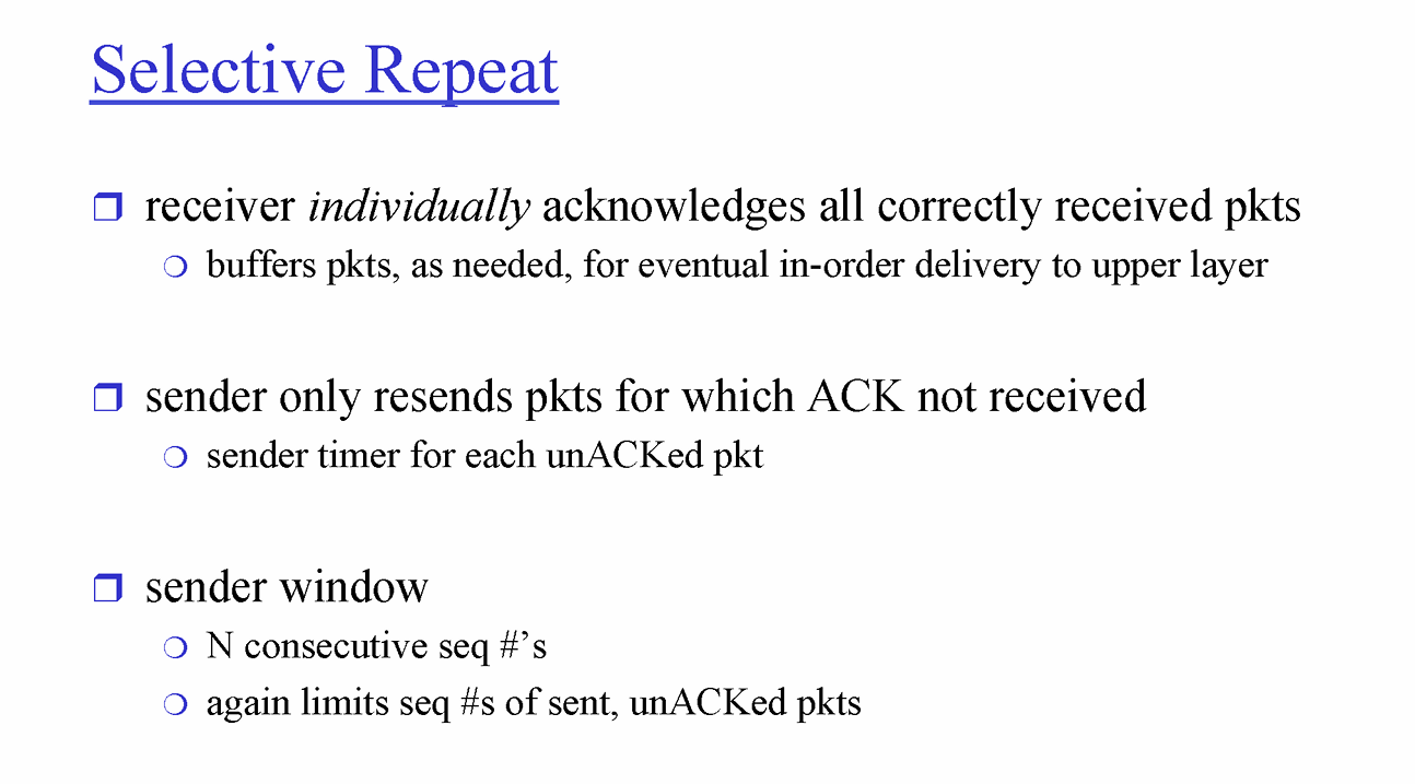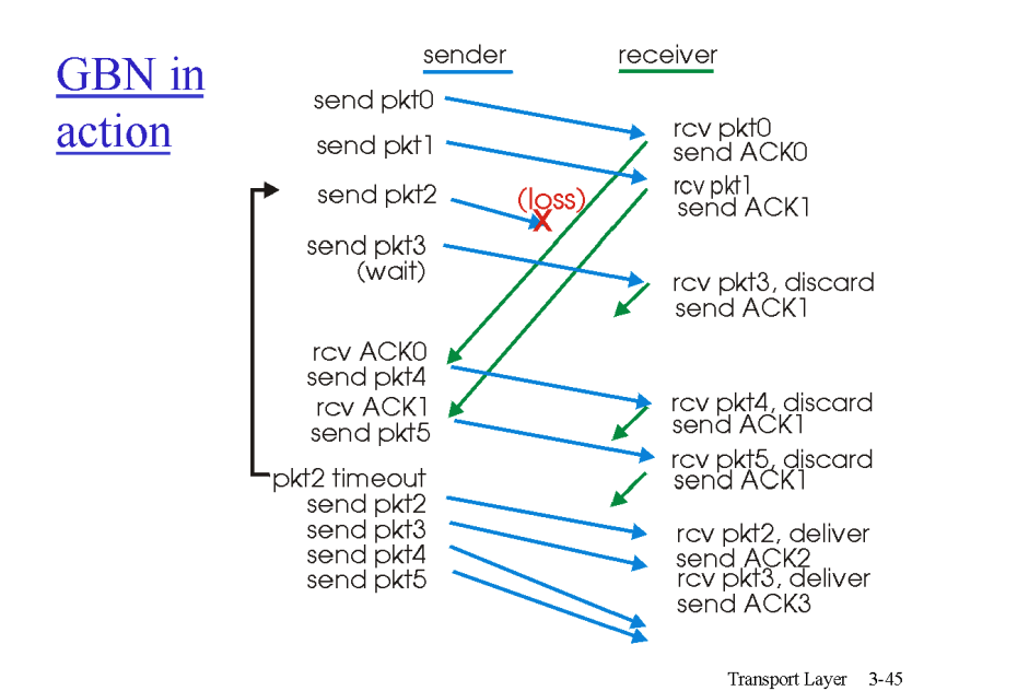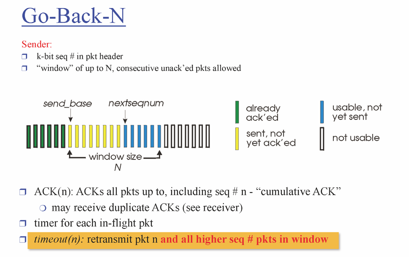 - ex) window size = 4, [0, 1, 2, 3] 전송할 때 timer 0 이 터졌으면 0이상의 모든 패킷들 다 재전송