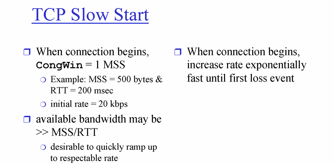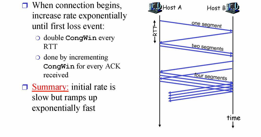 처음에 CongWin은 1 MSS 부터 2의 거듭제곱으로 개수를 키우면서 보낸다.