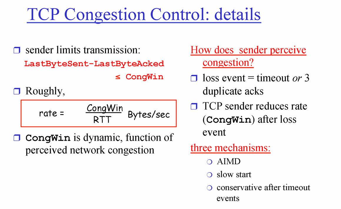 보내는 TCP에서 받는 양을 조절한다. 파이프마다 굵기가 다 다른데 가장 얇은 파이프에서 병목현상이 발생할 확률이 높기 때문에 그 부분이 critical point이다. 하지만 그 부분을 우리가 알 순 없다.