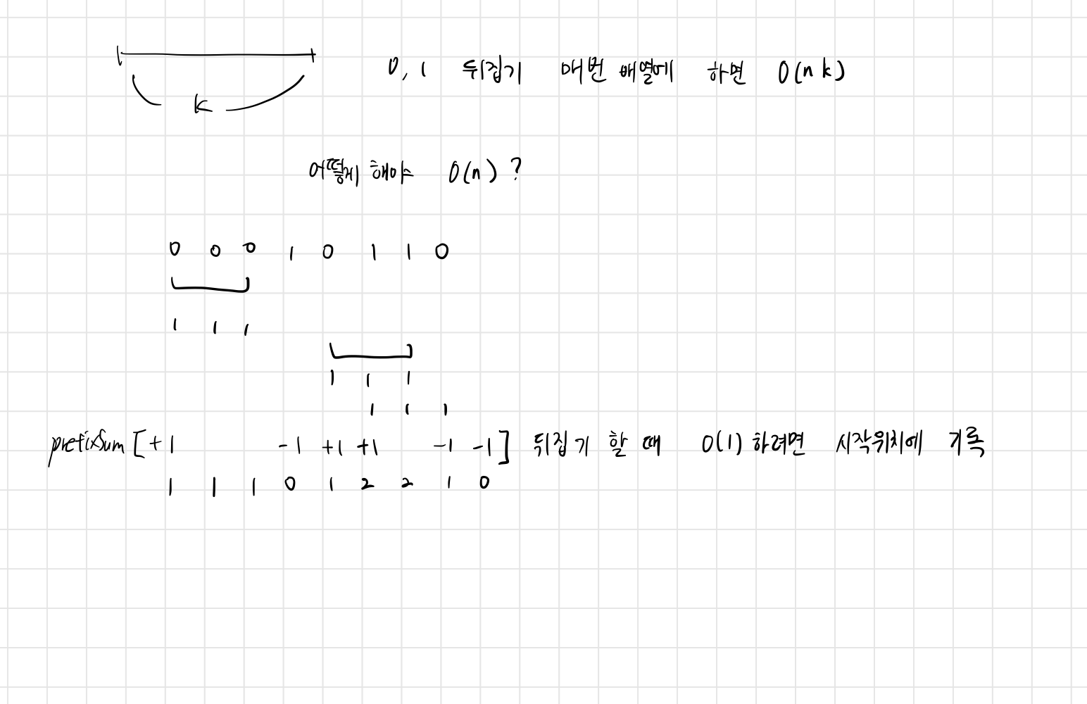 int currSum = 0; // 이전 뒤집기 기억해서 지금칸에 몇번 뒤집을지 0~k번 중 반영해야함