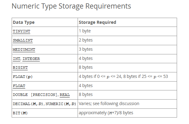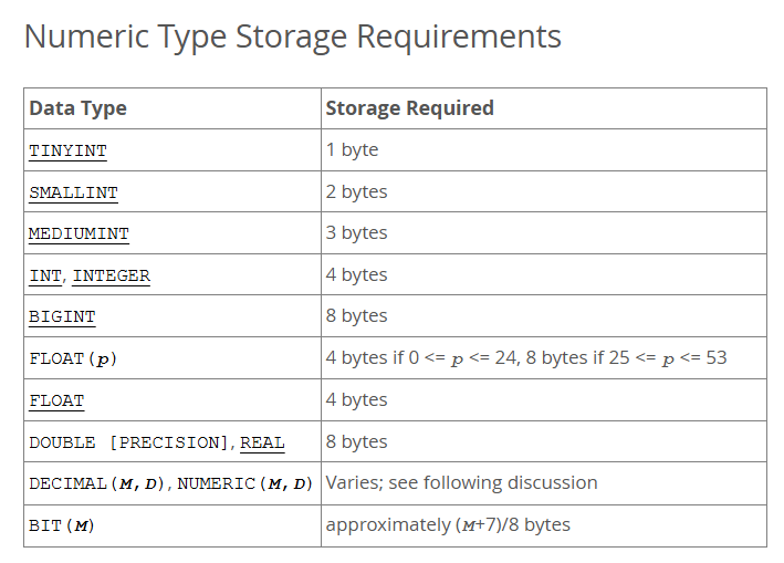 13.7 Data Type Storage Requirements 문서에서 명시한 저장 크기는 다음과 같다.