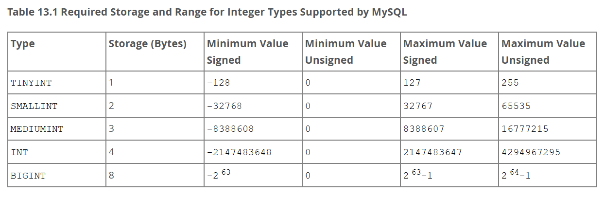 그리고 13.1.2 Integer Types 문서에서 각 타입의 범위를 명시한다.