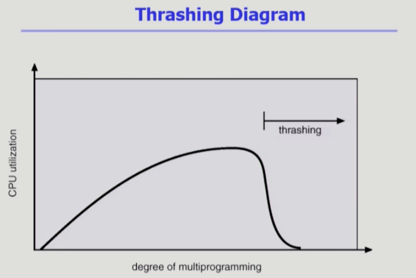 - 계속 멀티 프로그램의 개수가 높게 되면, Page fault rate 가 매우 높아지고, CPU utilization이 낮아짐. (프로세스의 원활한 수행에 필요한 최소한의 page frame 수를 할당 받지 못한 경우가 빈번해지기 때문에 비효율적)