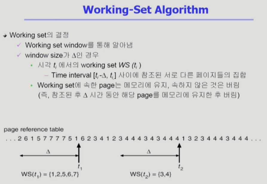 - 과거 델타 시간동안 참조된 페이지들을 워킹셋으로 간주해서, 메모리에서 쫓아내지 않는다. 델타 시간을 window라고 한다. 그래서 현재 시점부터 과거 window 사이즈 만큼 참조된 페이지는 메모리에 올려놔야 한다. (= 참조된 후 델타 시간동안 page를 메모리에 유지한 후에 버린다. ) working-set의 크기는 그때그때 바뀐다. 어느 시점에서의 window는 5이고, 어느 시점에서의 window는 2고 ... 그러면 할당해줘야 하는 frame수가 다르다.