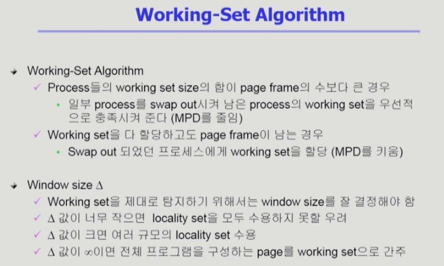 - Working set 모델에서는 process의 working set 전체가 메모리에 올라와 있어야 수행되고 그렇지 않을 경우 모든 frame을 반납한 후 swap out(suspend)됨.
