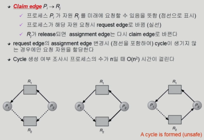 - 자원 요청에 대한 부가적인 정보를 이용해서 deadlock의 가능성이 없는 경우에만 자원을 할당