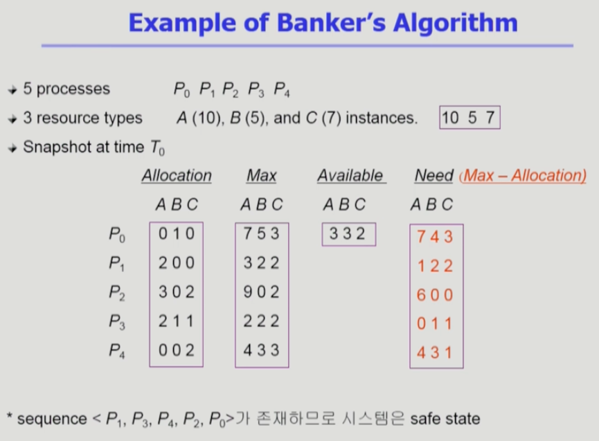 - 자원 할당이 deadlock으로부터 안전(safe)한지를 동적으로 조사해서 안전한 경우에만 할당. (항상 safe 상태 유지)