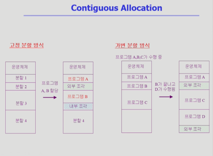 - 각각의 프로세스가 메모리의 연속적인 공간에 적재되도록 하는 것 (통째로 올라가는 것)