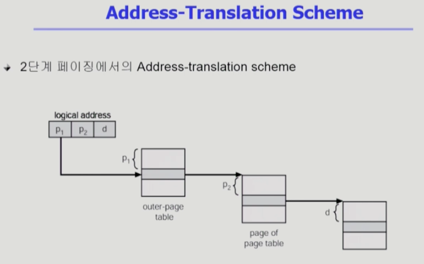여기서 p1은 outer page table의 index이고, p2는 outer page table의 page에서의 변위 (displacement)가 된다.