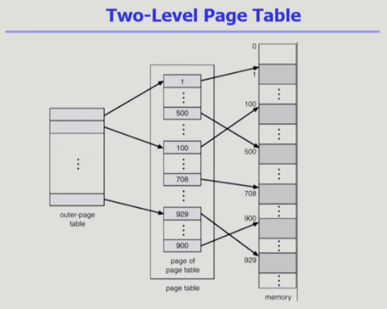 - 각 page entry가 4Byte일 시 프로세스 당 4M의 page table 필요.
