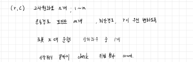 n개의 포인트가 존재합니다. 각 포인트는 1~n까지의 서로 다른 번호를 가집니다.m개의 포인트로 구성되고 로봇은 첫 포인트에서 시작해 할당된 포인트를 순서대로 방문합니다.x대이고, 모든 로봇은 0초에 동시에 출발합니다. 로봇은 1초마다 r 좌표와 c 좌표 중 하나가 1만큼 감소하거나 증가한 좌표로 이동할 수 있습니다.이동 중 같은 좌표에 로봇이 2대 이상 모인다면 충돌할 가능성이 있는 위험 상황으로 판단합니다. 관리자인 당신은 현재 설정대로 로봇이 움직일 때 위험한 상황이 총 몇 번 일어나는지 알고 싶습니다. 만약 어떤 시간에 여러 좌표에서 위험 상황이 발생한다면 그 횟수를 모두 더합니다.