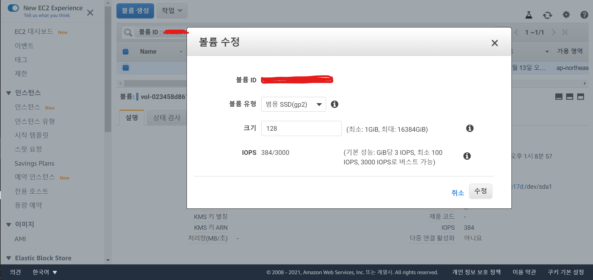 5) 볼륨 유형과 크기를 조절한 후, 수정을 누르면 인스턴스의 볼륨 설정이 수정된다.