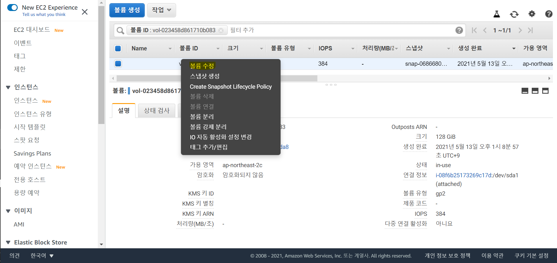 4) 볼륨 ID에 오른쪽 버튼을 클릭한 후, 볼륨 수정을 클릭한다.